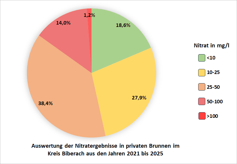 Die Auswertung der Brunnenwasserproben vom 15.09.2025 in Biberach zeigt immer noch eine hohe Nitratbelastung: In jeder neunten der 45 untersuchten privat genutzten Brunnen wurde der Nitratwert von 50 Milligramm pro Liter überschritten. Besonders erschreckend war die Belastung in je einem Brunnen Brunnen in Oggelshausen mit 65 Milligramm Nitrat pro Liter (mg/l), in Biberach mit 56 mg/l, in Kanzach mit 55 mg/l und in Dürmentingen mit 50 mg/l.