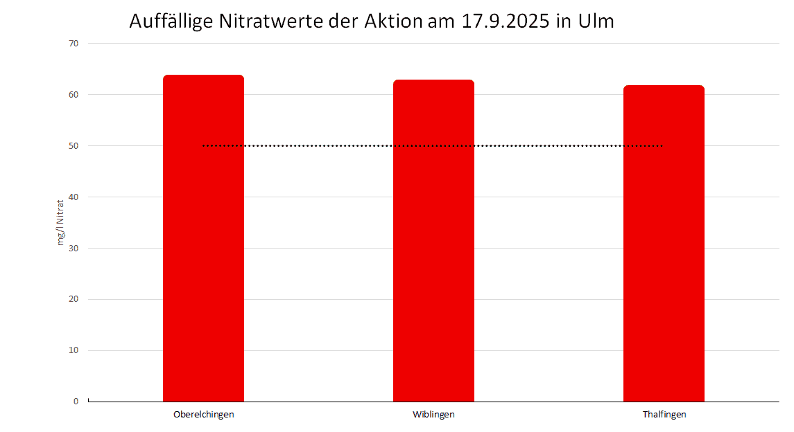 Die Auswertung der Brunnenwasserproben vom 17.9.2025 in Ulm zeigt immer noch eine hohe Nitratbelastung: In jeder zehnten der 28 untersuchten privat genutzten Brunnen wurde der Nitratwert von 50 Milligramm pro Liter überschritten. Besonders erschreckend war die Belastung in je einem Brunnen in Oberelchingen mit 63 Milligramm Nitrat pro Liter (mg/l), in Wiblingen mit 62 mg/l und in Thalfingen mit 61 mg/l.