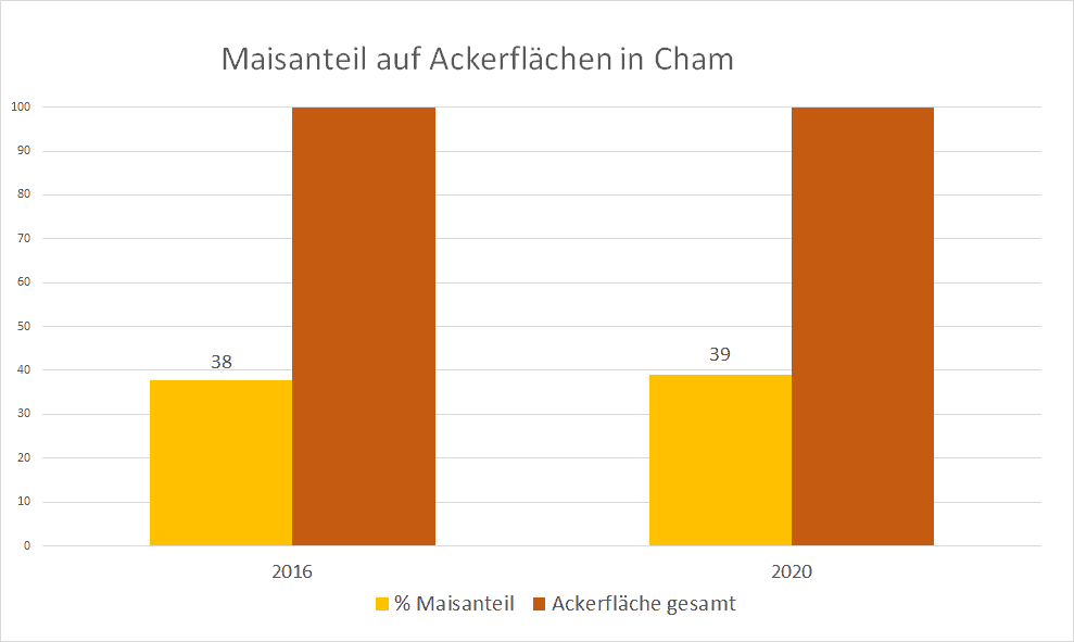 Auf der Grafik hat der VSR-Gewässerschutz die Entwicklung der Maisanbauflächen von 2016 bis 2020 im Kreis Cham dargestellt. Die Monokulturen mit Mais haben bereits zu einer starken Nitratbelastung des Grundwassers geführt. Zukünftig muss hier noch weiter gehandelt werden, um die Nitratbelastung zu senken. Der VSR-Gewässerschutz kritisiert den hohen Einsatz von Mais in Biogasanlagen. Die Förderung von Biogasanlagen sollte auf nachhaltige Substrate abzielen. Die weitere Absenkung des Maisdeckel bei neu geförderten Anlagen auf 30 % ist ein Schritt in die richtige Richtung, reicht aber noch nicht.