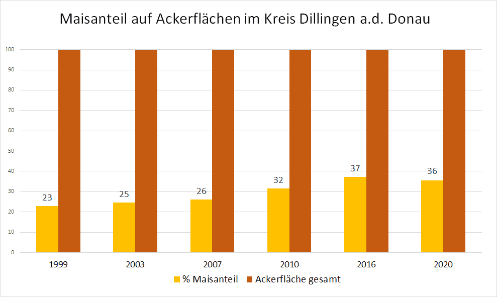 Auf der Grafik hat der VSR-Gewässerschutz die Entwicklung der Maisanbauflächen von 1999 bis 2020 im Kreis Dillingen/Donau dargestellt. Die Monokulturen mit Mais haben bereits zu einer starken Nitratbelastung des Grundwassers geführt. Zukünftig muss hier noch weiter gehandelt werden, um die Nitratbelastung zu senken. Der VSR-Gewässerschutz kritisiert den hohen Einsatz von Mais in Biogasanlagen. Die Förderung von Biogasanlagen sollte auf nachhaltige Substrate abzielen. Die weitere Absenkung des Maisdeckel bei neu geförderten Anlagen auf 30 % ist ein Schritt in die richtige Richtung, reicht aber noch nicht.