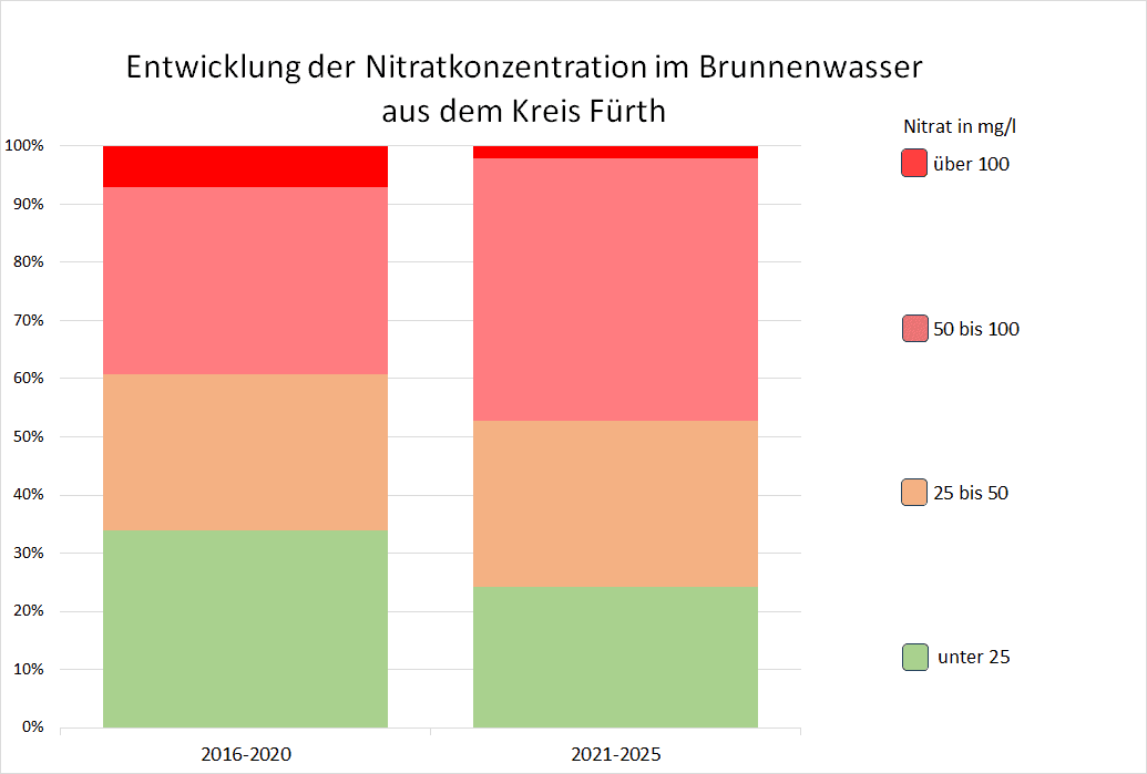 Der VSR-Gewässerschutz hat die Nitratergebnisse der 147 Brunnenwasseruntersuchungen im Kreis Fürth aus den Jahren 2016 bis 2025 ausgewertet. In dieser Zeit wurde der Nitratgrenzwert von 50 mg/l häufig nicht eingehalten. Während in den Jahren 2016–2020 noch 32,1 % der Brunnen den Grenzwert überschritten, ist die Belastung im Zeitraum 2021–2025 auf 45,1 % gestiegen. Besonders problematisch ist, dass der Anteil der Brunnen mit einer Nitratbelastung von über 100 mg/l im gesamten Zeitraum nur auf 2,2% sank. Auch ist In den letzten 5 Jahren zu beobachten, dass der Anteil der gering belasteten Brunnen, mit unter 25 mg/l Nitrat leicht zurückging. Insgesamt zeigt sich, dass die Maßnahmen in der Landwirtschaft zur Verringerung der Nitratbelastung im Grundwasser Wirkung zeigen. Allerdings ist die Nitratbelastung bisher nicht wie gehofft gesunken.
