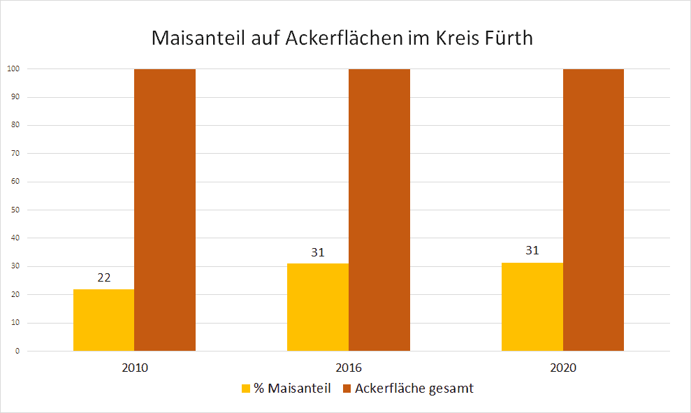 Auf der Grafik hat der VSR-Gewässerschutz die Entwicklung der Maisanbauflächen von 2010 bis 2020 im Kreis Fürth dargestellt. Die Monokulturen mit Mais haben bereits zu einer starken Nitratbelastung des Grundwassers geführt. Zukünftig muss hier noch weiter gehandelt werden, um die Nitratbelastung zu senken. Der VSR-Gewässerschutz kritisiert den hohen Einsatz von Mais in Biogasanlagen. Die Förderung von Biogasanlagen sollte auf nachhaltige Substrate abzielen. Die weitere Absenkung des Maisdeckel bei neu geförderten Anlagen auf 30 % ist ein Schritt in die richtige Richtung, reicht aber noch nicht.