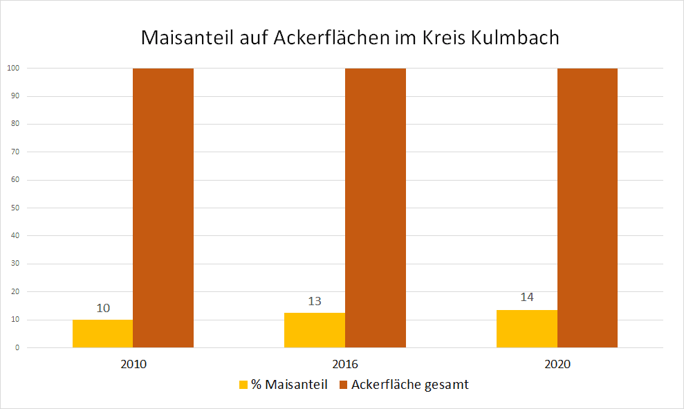 Auf der Grafik hat der VSR-Gewässerschutz die Entwicklung der Maisanbauflächen von 2010 bis 2020 im Kreis Kulmbach dargestellt. Die Monokulturen mit Mais haben bereits zu einer starken Nitratbelastung des Grundwassers geführt. Zukünftig muss hier noch weiter gehandelt werden, um die Nitratbelastung zu senken. Der VSR-Gewässerschutz kritisiert den hohen Einsatz von Mais in Biogasanlagen. Die Förderung von Biogasanlagen sollte auf nachhaltige Substrate abzielen. Die weitere Absenkung des Maisdeckel bei neu geförderten Anlagen auf 30 % ist ein Schritt in die richtige Richtung, reicht aber noch nicht.