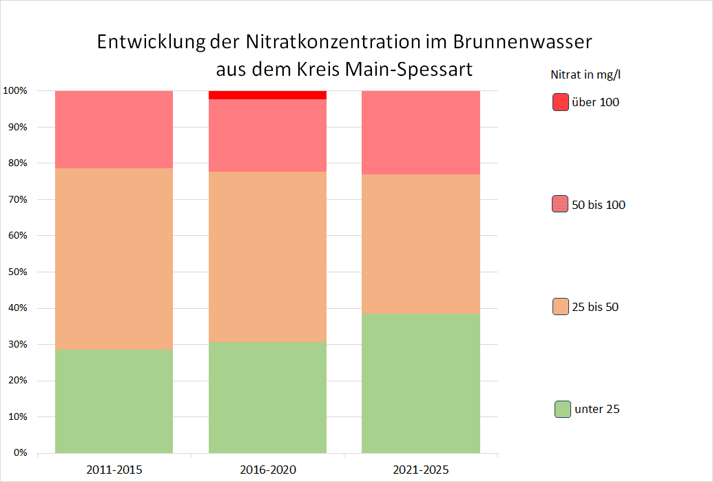 Der VSR-Gewässerschutz hat die Nitratergebnisse der 125 Brunnenwasseruntersuchungen im Kreis Main-Spessart aus den Jahren 2011 bis 2025 ausgewertet. In dieser Zeit wurde der Nitratgrenzwert von 50 mg/l häufig nicht eingehalten. Während in den Jahren 2011–2015 noch 21,4, % der Brunnen den Grenzwert überschritten, ist die Belastung im Zeitraum 2021–2025 auf 23,1 % gestiegen. Auch ist zu beobachten, dass der Anteil der gering belasteten Brunnen, mit unter 25 mg/l Nitrat anstieg.Insgesamt zeigt sich, dass die Maßnahmen in der Landwirtschaft zur Verringerung der Nitratbelastung im Grundwasser Wirkung zeigen. Allerdings ist die Nitratbelastung bisher nicht wie gehofft gesunken.
