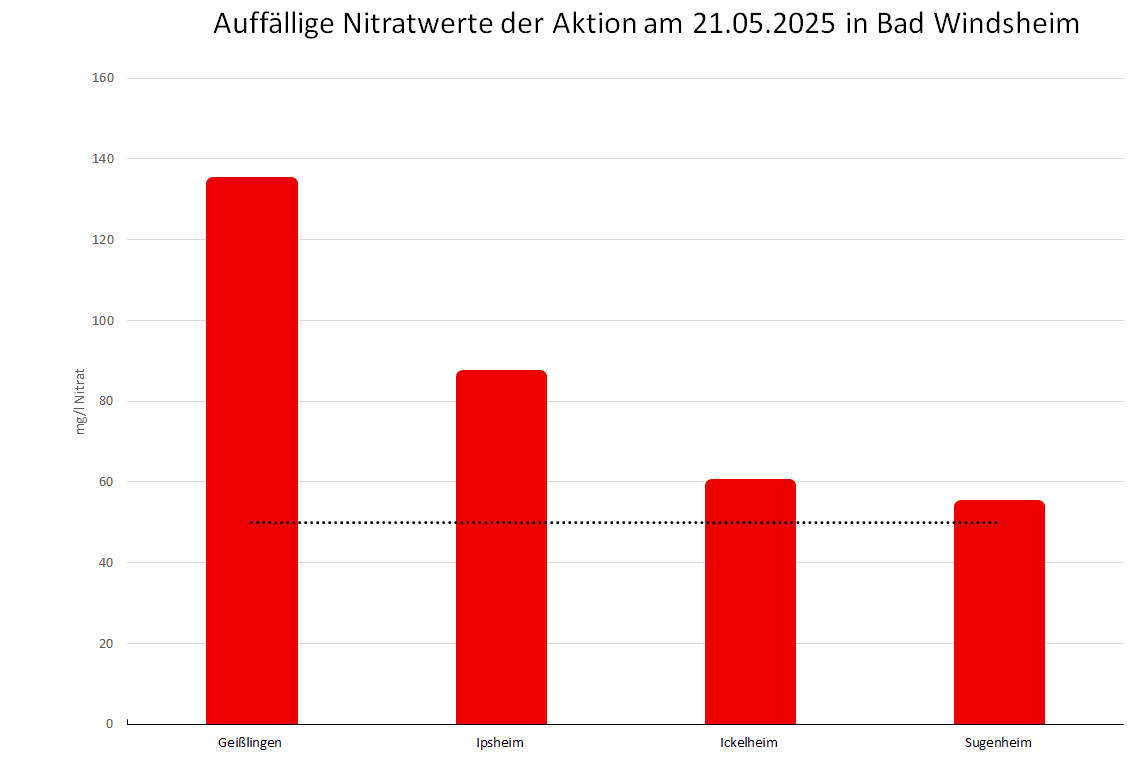 Die Auswertung der Brunnenwasserproben vom 21.5.2025 in Bad Windsheim zeigt immer noch eine hohe Nitratbelastung: In jedem fünften der 27 untersuchten privat genutzten Brunnen wurde der Nitratwert von 50 Milligramm pro Liter überschritten. Besonders erschreckend war die Belastung Belastung in je einem Brunnen in Geißlingen mit 134 Milligramm Nitrat pro Liter (mg/l) und in Ipsheim mit 86 mg/l. Etwas weniger hoch belastet ist das Brunnenwasser in Ickelheim mit 59 mg/l Nitrat und in Sugenheim mit 54 mg/l.
