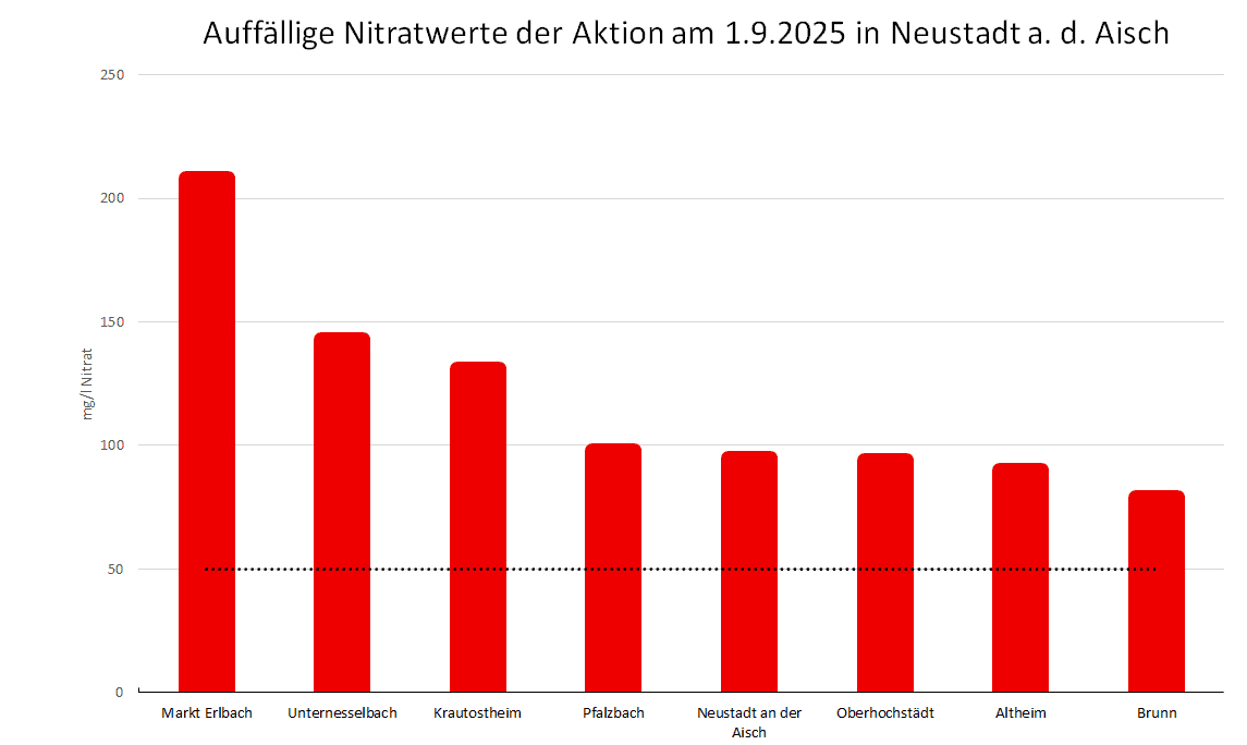 Die Auswertung der Brunnenwasserproben vom 01.9.2025 in Neustadt an der Aisch zeigt immer noch eine hohe Nitratbelastung: In jedem zweiten der 77 untersuchten privat genutzten Brunnen wurde der Nitratwert von 50 Milligramm pro Liter überschritten. Besonders erschreckend war die Belastung Belastung in je einem Brunnen in Markt Erlbach mit 210 Milligramm Nitrat pro Liter (mg/l), in Unternesselbach mit 145 mg/l, in Krautostheim mit 133 mg/l und in Pfalzbach mit 100 mg/l. Belastet ist auch das Brunnenwasser in Neustadt an der Aisch mit 97 mg/l Nitrat, in Oberhochstädt mit 96 mg/l, in Altheim mit 92 mg/l und in Brunn mit 80 mg/l.