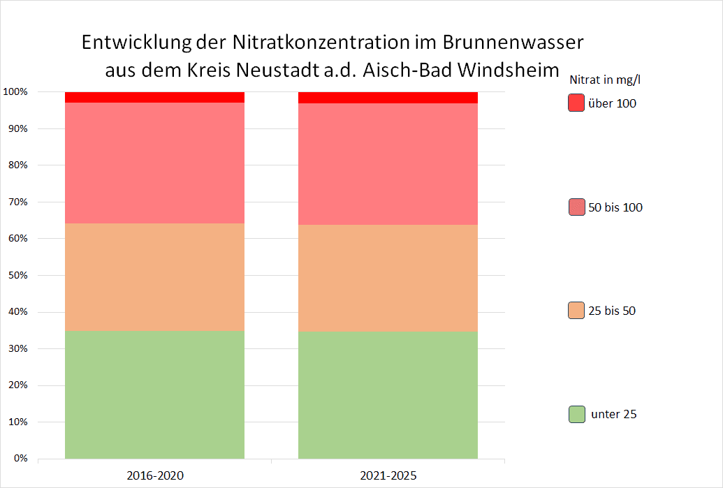 Der VSR-Gewässerschutz hat die Nitratergebnisse der 408 Brunnenwasseruntersuchungen im Kreis Neustadt an der Aisch-Bad Windsheim aus den Jahren 2016 bis 2025 ausgewertet. In dieser Zeit wurde der Nitratgrenzwert von 50 mg/l häufig nicht eingehalten. Während in den Jahren 2016–2020 noch 35,8 % der Brunnen den Grenzwert überschritten, ist die Belastung im Zeitraum 2021–2025 auf 36,2 % gestiegen. Besonders problematisch ist, dass der Anteil der Brunnen mit einer Nitratbelastung von über 100 mg/l im gesamten Zeitraum auf 3,1 % stieg.