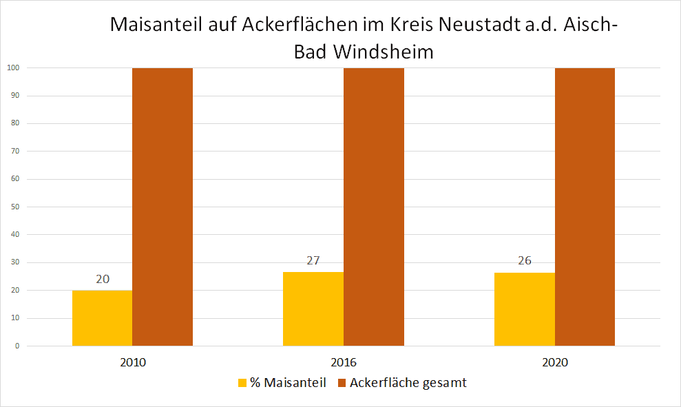 Auf der Grafik hat der VSR-Gewässerschutz die Entwicklung der Maisanbauflächen von 2010 bis 2020 im Kreis Neustadt an der Aisch-Bad Windsheim dargestellt. Die Monokulturen mit Mais haben bereits zu einer starken Nitratbelastung des Grundwassers geführt. Zukünftig muss hier noch weiter gehandelt werden, um die Nitratbelastung zu senken. Der VSR-Gewässerschutz kritisiert den hohen Einsatz von Mais in Biogasanlagen. Die Förderung von Biogasanlagen sollte auf nachhaltige Substrate abzielen. Die weitere Absenkung des Maisdeckel bei neu geförderten Anlagen auf 30 % ist ein Schritt in die richtige Richtung, reicht aber noch nicht.