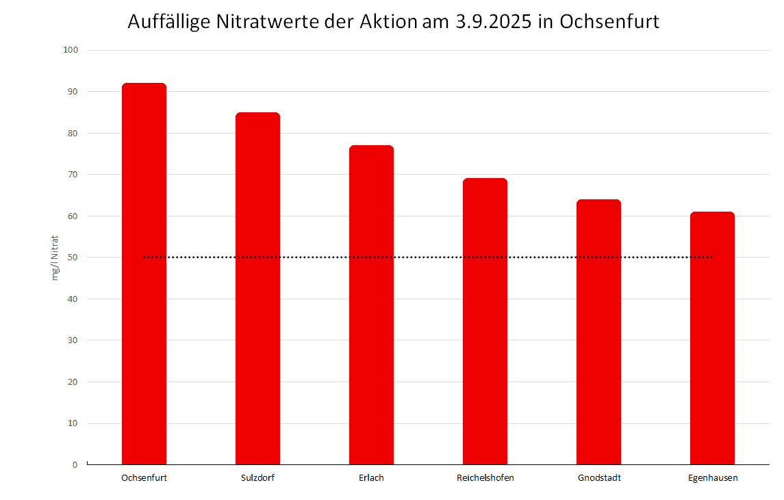 Die Auswertung der Brunnenwasserproben vom 3.9.2025 in Ochsenfurt zeigt immer noch eine hohe Nitratbelastung: In jeder zweiten der 17 untersuchten privat genutzten Brunnen wurde der Nitratwert von 50 Milligramm pro Liter überschritten. Besonders erschreckend war die Belastung in je einem Brunnen in Ochsenfurt mit 92 Milligramm Nitrat pro Liter (mg/l), in Sulzdorf mit 85 mg/l und in Erlach mit 77 mg/l. Etwas weniger hoch belastet ist das Brunnenwasser in Reichelshofen mit 69 mg/l Nitrat, in Gnodstadt mit 64 mg/l und in Egenhausen mit 61 mg/l.