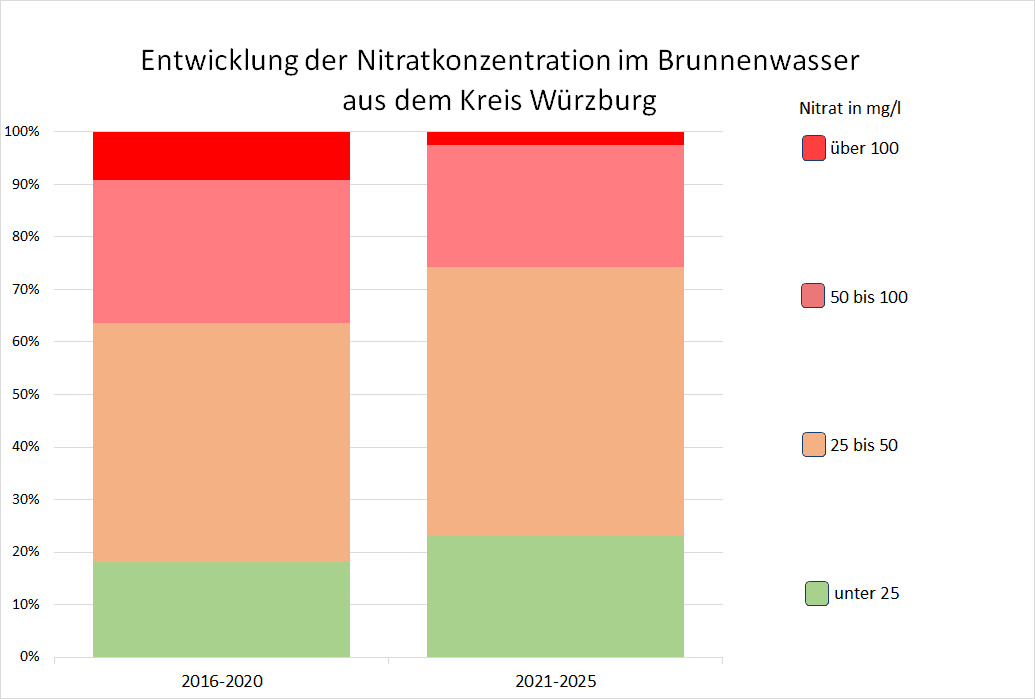 Der VSR-Gewässerschutz hat die Nitratergebnisse der 72 Brunnenwasseruntersuchungen im Kreis Würzburg aus den Jahren 2016 bis 2025 ausgewertet. In dieser Zeit wurde der Nitratgrenzwert von 50 mg/l häufig nicht eingehalten. Während in den Jahren 2016–2020 noch 36,4 % der Brunnen den Grenzwert überschritten, waren es im Zeitraum 2021–2025 immer noch 25,6 %. Besonders problematisch ist, dass der Anteil der Brunnen mit einer Nitratbelastung von über 100 mg/l im gesamten Zeitraum nur auf 2,6 % sank. Auch ist zu beobachten, dass der Anteil der gering belasteten Brunnen, mit unter 25 mg/l Nitrat ansteigt. Insgesamt zeigt sich, dass die Maßnahmen in der Landwirtschaft zur Verringerung der Nitratbelastung im Grundwasser Wirkung zeigen. Allerdings ist die Nitratbelastung bisher nicht wie gehofft gesunken.