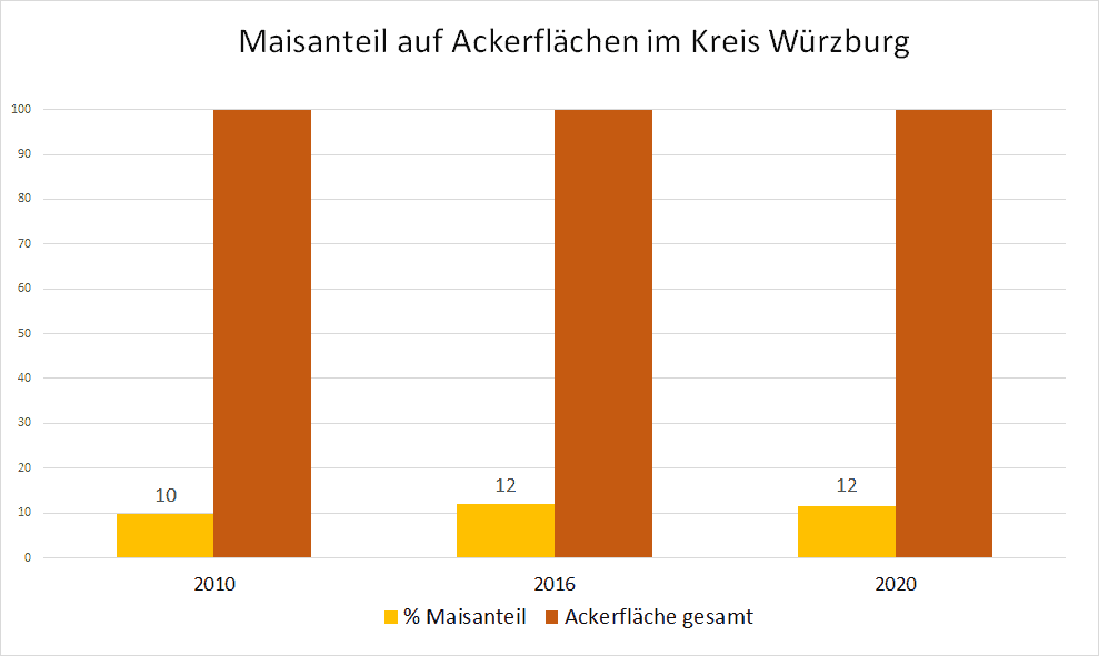 Auf der Grafik hat der VSR-Gewässerschutz die Entwicklung der Maisanbauflächen von 2010 bis 2020 im Kreis Würzburg dargestellt. Die Monokulturen mit Mais haben bereits zu einer starken Nitratbelastung des Grundwassers geführt. Zukünftig muss hier noch weiter gehandelt werden, um die Nitratbelastung zu senken. Der VSR-Gewässerschutz kritisiert den hohen Einsatz von Mais in Biogasanlagen. Die Förderung von Biogasanlagen sollte auf nachhaltige Substrate abzielen. Die weitere Absenkung des Maisdeckel bei neu geförderten Anlagen auf 30 % ist ein Schritt in die richtige Richtung, reicht aber noch nicht.