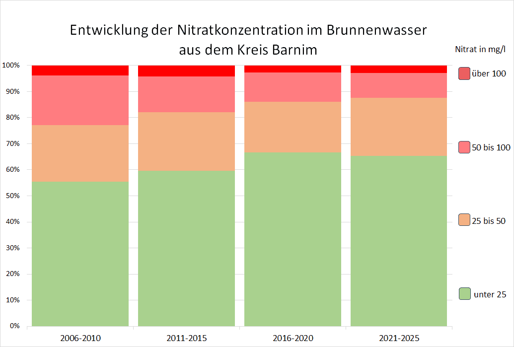 Der VSR-Gewässerschutz hat die Nitratergebnisse der Brunnenwasseruntersuchungen im Kreis Barnim aus den Jahren 2006 bis 2025 ausgewertet. In dieser Zeit wurde der Nitratgrenzwert von 50 mg/l häufig nicht eingehalten. Während in den Jahren 2006–2010 noch 22,8 % der Brunnen den Grenzwert überschritten, waren es im Zeitraum 2021–2025 immer noch 12,4 %. Besonders problematisch ist, dass der Anteil der Brunnen mit einer Nitratbelastung von über 100 mg/l im gesamten Zeitraum nur auf 2,9% sank. Auch ist in den letzten 5 Jahren zu beobachten, dass der Anteil der gering belasteten Brunnen, mit unter 25 mg/l Nitrat leicht zurückging. Allerdings ist die Nitratbelastung bisher nicht wie gehofft gesunken.