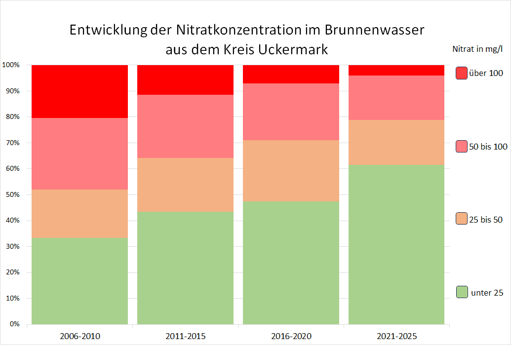 Der VSR-Gewässerschutz hat die Nitratergebnisse der 840 Brunnenwasseruntersuchungen im Kreis Uckermark aus den Jahren 2001 bis 2025 ausgewertet. In dieser Zeit wurde der Nitratgrenzwert von 50 mg/l häufig nicht eingehalten. Während in den Jahren 2001–2005 noch 32,6 % der Brunnen den Grenzwert überschritten, waren es im Zeitraum 2021–2025 immer noch 24,1 %. Allerdings ist die Nitratbelastung bisher nicht wie gehofft gesunken.