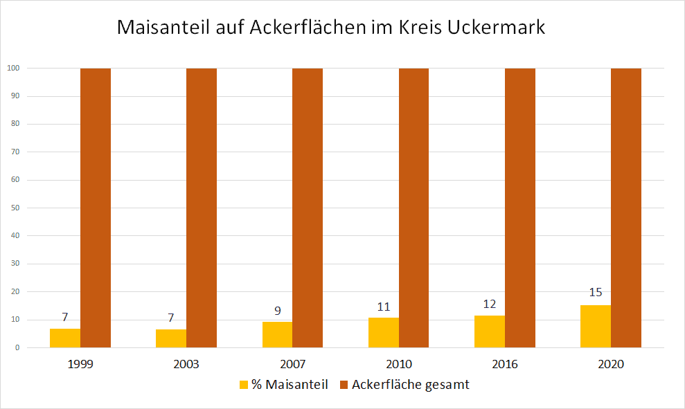 Auf der Grafik hat der VSR-Gewässerschutz die Entwicklung der Maisanbauflächen von 1999 bis 2020 im Kreis Uckermark dargestellt. Die Monokulturen mit Mais haben bereits zu einer starken Nitratbelastung des Grundwassers geführt. Zukünftig muss hier noch weiter gehandelt werden, um die Nitratbelastung zu senken. Der VSR-Gewässerschutz kritisiert den hohen Einsatz von Mais in Biogasanlagen. Die Förderung von Biogasanlagen sollte auf nachhaltige Substrate abzielen. Die weitere Absenkung des Maisdeckel bei neu geförderten Anlagen auf 30 % ist ein Schritt in die richtige Richtung, reicht aber noch nicht.