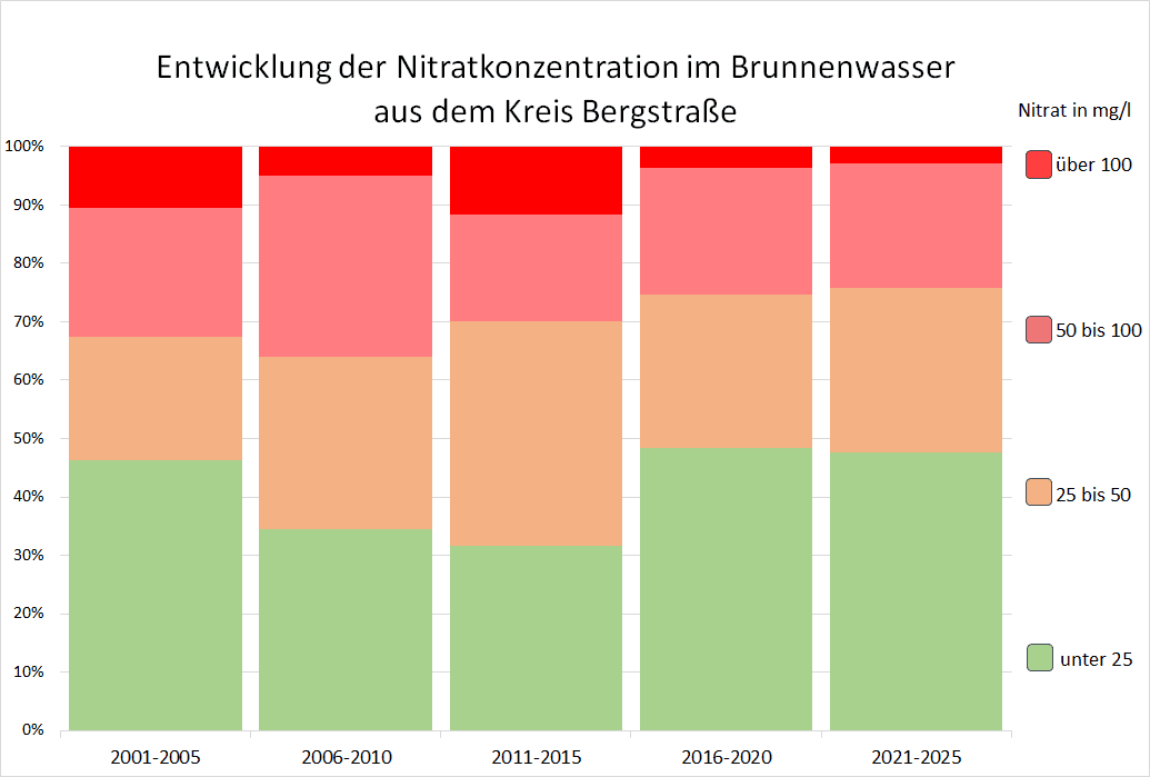 Der VSR-Gewässerschutz hat die Nitratergebnisse der 924 Brunnenwasseruntersuchungen im Kreis Bergstraße aus den Jahren 2001 bis 2025 ausgewertet. In dieser Zeit wurde der Nitratgrenzwert von 50 mg/l häufig nicht eingehalten. Während in den Jahren 2001–2005 noch 32,6 % der Brunnen den Grenzwert überschritten, waren es im Zeitraum 2021–2025 immer noch 24,1 %. Besonders problematisch ist, dass der Anteil der Brunnen mit einer Nitratbelastung von über 100 mg/l im gesamten Zeitraum nur auf 2,9 % sank. Auch ist in den letzten 5 Jahren zu beobachten, dass der Anteil der gering belasteten Brunnen, mit unter 25 mg/l Nitrat leicht zurückging. Allerdings ist die Nitratbelastung bisher nicht wie gehofft gesunken.
