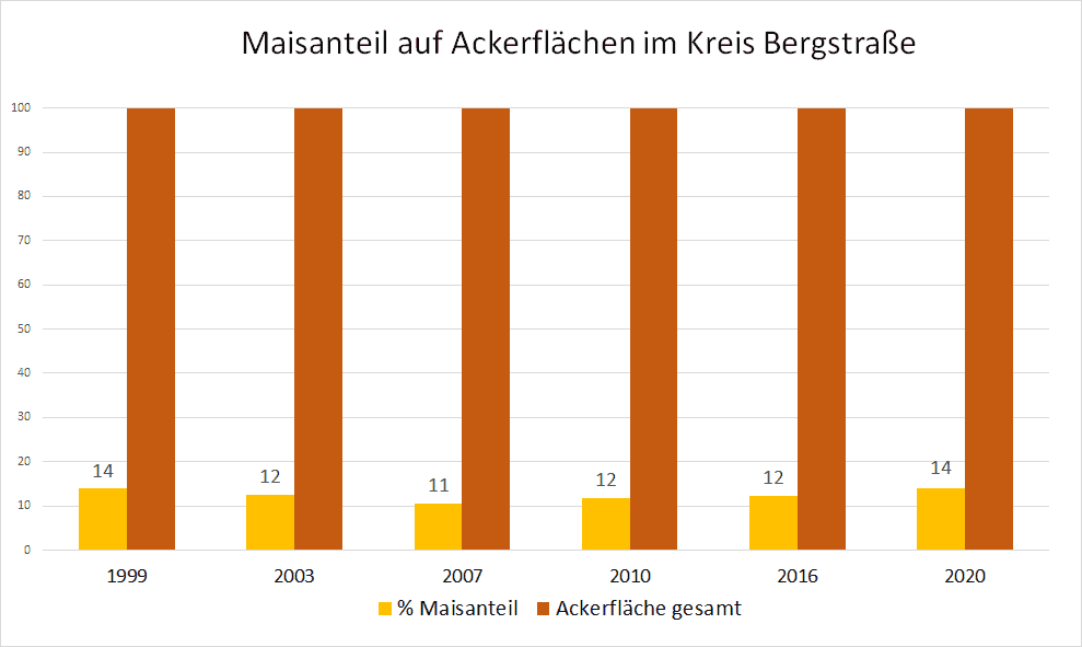 Auf der Grafik hat der VSR-Gewässerschutz die Entwicklung der Maisanbauflächen von 1999 bis 2020 im Kreis Bergstraße dargestellt. Die Monokulturen mit Mais haben bereits zu einer starken Nitratbelastung des Grundwassers geführt. Zukünftig muss hier noch weiter gehandelt werden, um die Nitratbelastung zu senken. Der VSR-Gewässerschutz kritisiert den hohen Einsatz von Mais in Biogasanlagen. Die Förderung von Biogasanlagen sollte auf nachhaltige Substrate abzielen. Die weitere Absenkung des Maisdeckel bei neu geförderten Anlagen auf 30 % ist ein Schritt in die richtige Richtung, reicht aber noch nicht.