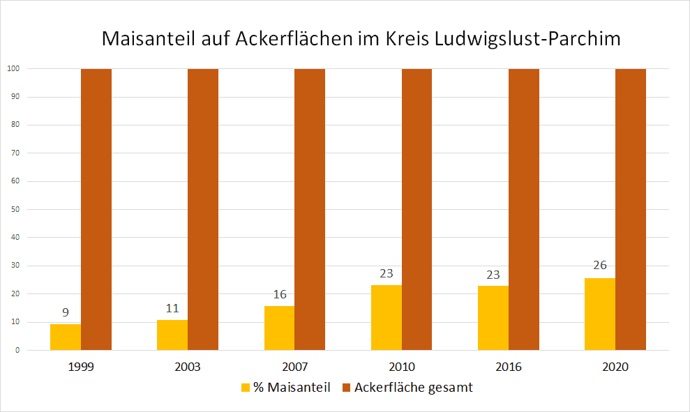 Auf der Grafik hat der VSR-Gewässerschutz die Entwicklung der Maisanbauflächen von 1999 bis 2020 im Kreis Ludwigslust-Parchim dargestellt. Die Monokulturen mit Mais haben bereits zu einer starken Nitratbelastung des Grundwassers geführt. Zukünftig muss hier noch weiter gehandelt werden, um die Nitratbelastung zu senken. Der VSR-Gewässerschutz kritisiert den hohen Einsatz von Mais in Biogasanlagen. Die Förderung von Biogasanlagen sollte auf nachhaltige Substrate abzielen. Die weitere Absenkung des Maisdeckel bei neu geförderten Anlagen auf 30 % ist ein Schritt in die richtige Richtung, reicht aber noch nicht.