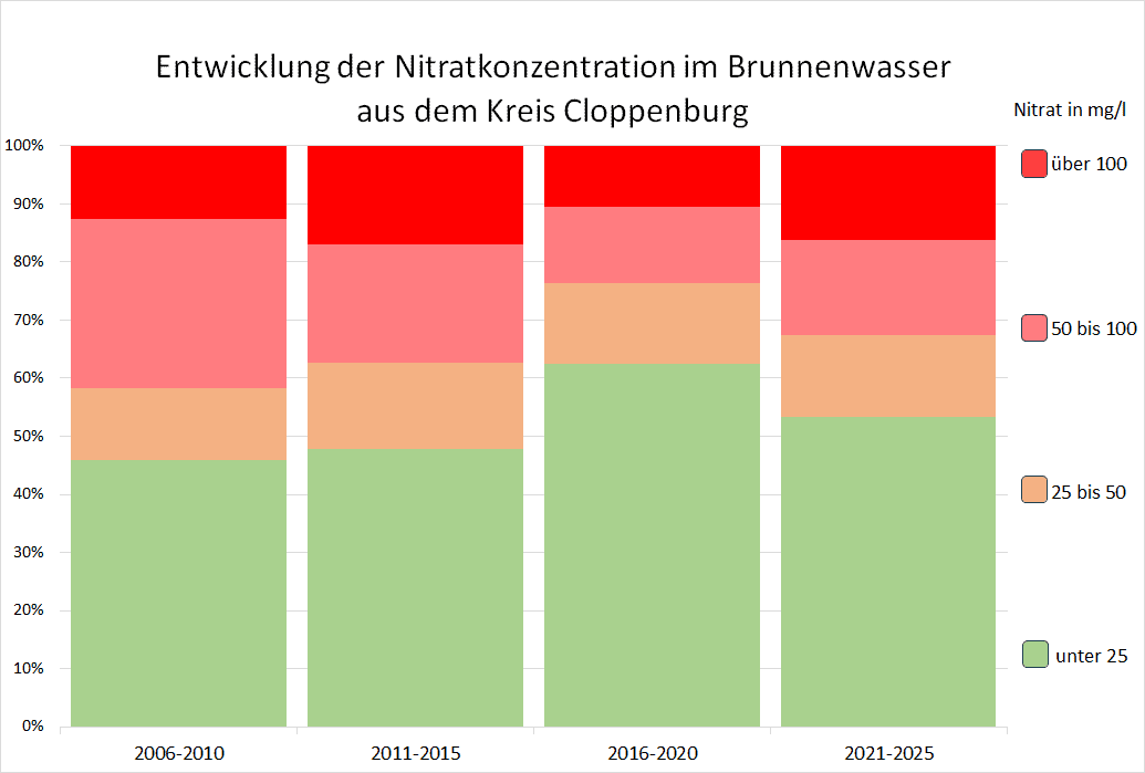 Der VSR-Gewässerschutz hat die Nitratergebnisse der 557 Brunnenwasseruntersuchungen im Kreis Cloppenburg aus den Jahren 2006 bis 2025 ausgewertet. In dieser Zeit wurde der Nitratgrenzwert von 50 mg/l häufig nicht eingehalten. Während in den Jahren 2006–2010 noch 41,7 % der Brunnen den Grenzwert überschritten, waren es im Zeitraum 2021–2025 immer noch 32,6 %. Zwischenzeitlich in den Jahren von 2016–2020 waren 23,7 % Brunnen mir Nitrat belastet. Besonders problematisch ist, dass der Anteil der Brunnen mit einer Nitratbelastung von über 100 mg/l im gesamten Zeitraum auf 2,6% stieg. Auch ist in den letzten 5 Jahren zu beobachten, dass der Anteil der gering belasteten Brunnen, mit unter 25 mg/l Nitrat leicht zurückging.