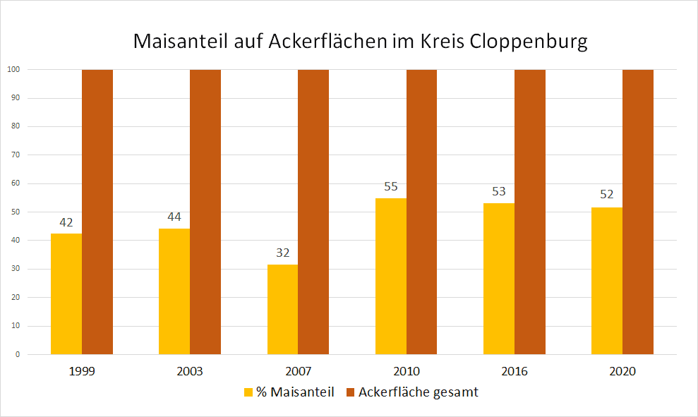 Auf der Grafik hat der VSR-Gewässerschutz die Entwicklung der Maisanbauflächen von 1999 bis 2020 im Kreis Cloppenburg dargestellt. Die Monokulturen mit Mais haben bereits zu einer starken Nitratbelastung des Grundwassers geführt. Zukünftig muss hier noch weiter gehandelt werden, um die Nitratbelastung zu senken. Der VSR-Gewässerschutz kritisiert den hohen Einsatz von Mais in Biogasanlagen. Die Förderung von Biogasanlagen sollte auf nachhaltige Substrate abzielen. Die weitere Absenkung des Maisdeckel bei neu geförderten Anlagen auf 30 % ist ein Schritt in die richtige Richtung, reicht aber noch nicht.