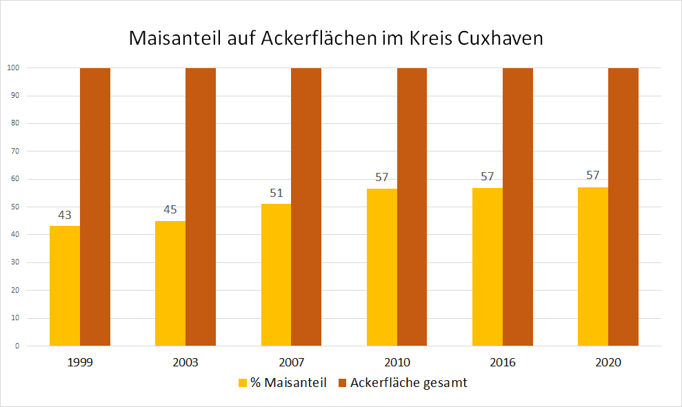 Auf der Grafik hat der VSR-Gewässerschutz die Entwicklung der Maisanbauflächen von 1999 bis 2020 im Kreis Cuxhavendargestellt. Die Monokulturen mit Mais haben bereits zu einer starken Nitratbelastung des Grundwassers geführt. Zukünftig muss hier noch weiter gehandelt werden, um die Nitratbelastung zu senken. Der VSR-Gewässerschutz kritisiert den hohen Einsatz von Mais in Biogasanlagen. Die Förderung von Biogasanlagen sollte auf nachhaltige Substrate abzielen. Die weitere Absenkung des Maisdeckel bei neu geförderten Anlagen auf 30 % ist ein Schritt in die richtige Richtung, reicht aber noch nicht.