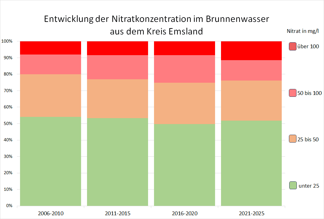 Der VSR-Gewässerschutz hat die Nitratergebnisse der 804 Brunnenwasseruntersuchungen im Kreis Emsland aus den Jahren 2006 bis 2025 ausgewertet. In dieser Zeit wurde der Nitratgrenzwert von 50 mg/l häufig nicht eingehalten. Während in den Jahren 2006–2010 noch 20 % der Brunnen den Grenzwert überschritten, ist die Belastung im Zeitraum 2021–2025 auf 23,8 % gestiegen. Besonders problematisch ist, dass der Anteil der Brunnen mit einer Nitratbelastung von über 100 mg/l im gesamten Zeitraum auf 11,4 % stieg. Auch ist zu beobachten, dass der Anteil der gering belasteten Brunnen, mit unter 25 mg/l Nitrat zurückging.