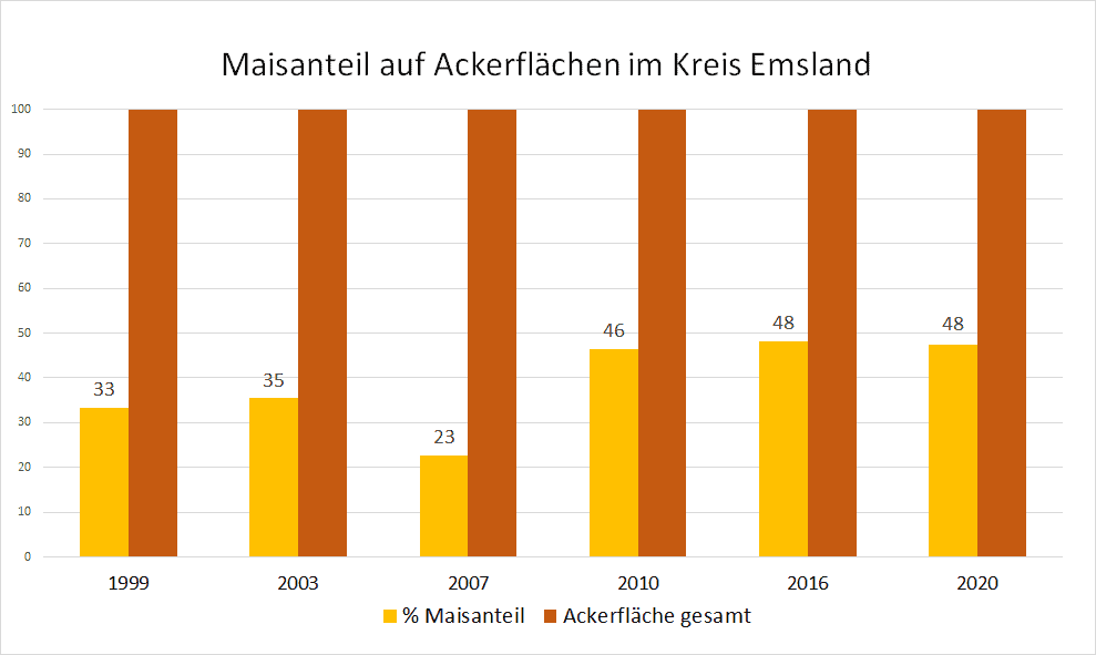 Auf der Grafik hat der VSR-Gewässerschutz die Entwicklung der Maisanbauflächen von 1999 bis 2020 im Kreis Emsland dargestellt. Die Monokulturen mit Mais haben bereits zu einer starken Nitratbelastung des Grundwassers geführt. Zukünftig muss hier noch weiter gehandelt werden, um die Nitratbelastung zu senken. Der VSR-Gewässerschutz kritisiert den hohen Einsatz von Mais in Biogasanlagen. Die Förderung von Biogasanlagen sollte auf nachhaltige Substrate abzielen. Die weitere Absenkung des Maisdeckel bei neu geförderten Anlagen auf 30 % ist ein Schritt in die richtige Richtung, reicht aber noch nicht.