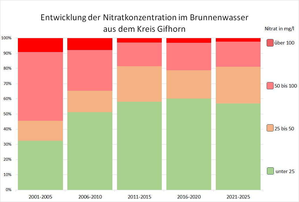 Der VSR-Gewässerschutz hat die Nitratergebnisse der 1158 Brunnenwasseruntersuchungen im Kreis Gifhorn aus den Jahren 2001 bis 2025 ausgewertet. In dieser Zeit wurde der Nitratgrenzwert von 50 mg/l häufig nicht eingehalten. Während in den Jahren 2001–2005 noch 54,6 % der Brunnen den Grenzwert überschritten, waren es im Zeitraum 2021–2025 immer noch 18,9 %. Besonders problematisch ist, dass der Anteil der Brunnen mit einer Nitratbelastung von über 100 mg/l im gesamten Zeitraum nur auf 2,4 % sank. Auch ist in den letzten 5 Jahren zu beobachten, dass der Anteil der gering belasteten Brunnen, mit unter 25 mg/l Nitrat leicht zurückging. Insgesamt zeigt sich, dass die Maßnahmen in der Landwirtschaft zur Verringerung der Nitratbelastung im Grundwasser Wirkung zeigen. Allerdings ist die Nitratbelastung bisher nicht wie gehofft gesunken.