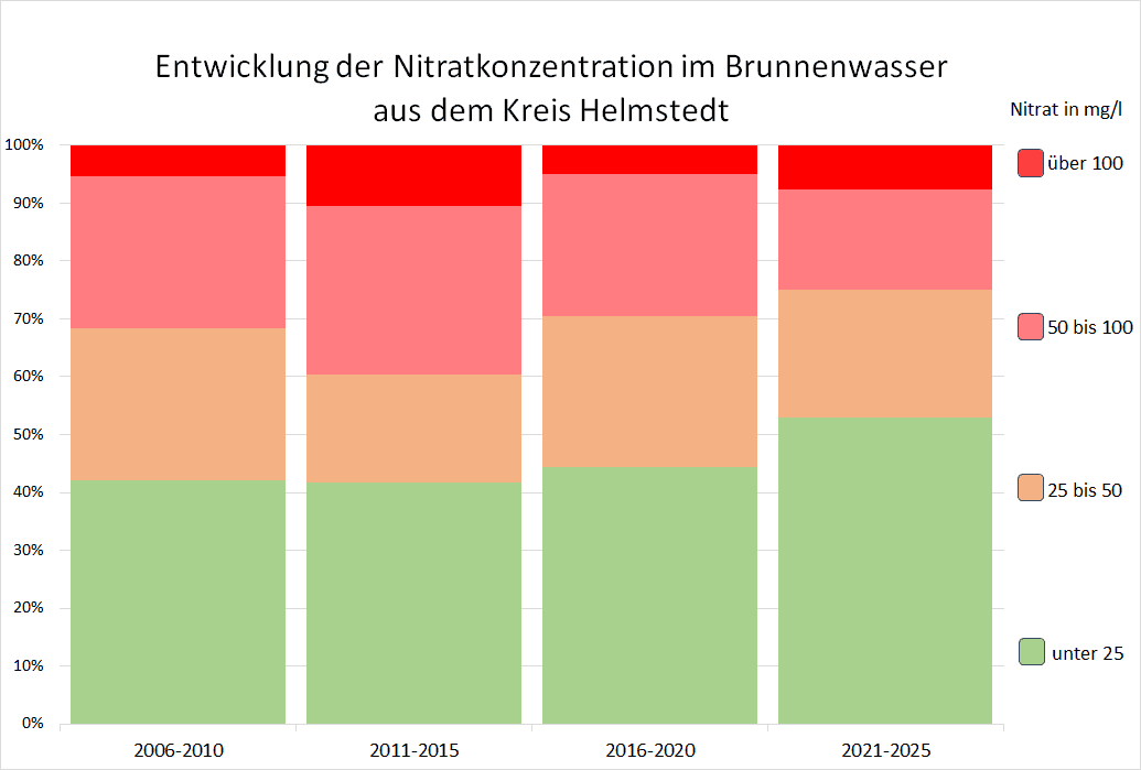 Der VSR-Gewässerschutz hat die Nitratergebnisse der 413 Brunnenwasseruntersuchungen im Kreis Helmstedt aus den Jahren 2006 bis 2025 ausgewertet. In dieser Zeit wurde der Nitratgrenzwert von 50 mg/l häufig nicht eingehalten. Während in den Jahren 2006–2010 noch 31,6 % der Brunnen den Grenzwert überschritten, waren es im Zeitraum 2021–2025 immer noch 25 %. Besonders problematisch ist, dass der Anteil der Brunnen mit einer Nitratbelastung von über 100 mg/l im gesamten Zeitraum auf 7,7% stieg. Auch ist zu beobachten, dass der Anteil der gering belasteten Brunnen, mit unter 25 mg/l Nitrat ansteigt. Insgesamt zeigt sich, dass die Maßnahmen in der Landwirtschaft zur Verringerung der Nitratbelastung im Grundwasser Wirkung zeigen. Allerdings ist die Nitratbelastung bisher nicht wie gehofft gesunken.