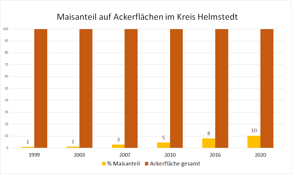 Auf der Grafik hat der VSR-Gewässerschutz die Entwicklung der Maisanbauflächen von 1999 bis 2020 im Kreis Helmstedt dargestellt. Die Monokulturen mit Mais haben bereits zu einer starken Nitratbelastung des Grundwassers geführt. Zukünftig muss hier noch weiter gehandelt werden, um die Nitratbelastung zu senken. Der VSR-Gewässerschutz kritisiert den hohen Einsatz von Mais in Biogasanlagen. Die Förderung von Biogasanlagen sollte auf nachhaltige Substrate abzielen. Die weitere Absenkung des Maisdeckel bei neu geförderten Anlagen auf 30 % ist ein Schritt in die richtige Richtung, reicht aber noch nicht.