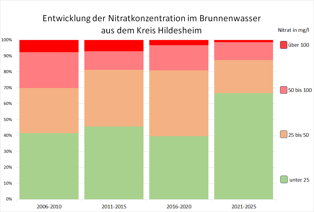 Der VSR-Gewässerschutz hat die Nitratergebnisse der 317 Brunnenwasseruntersuchungen im Kreis Hildesheim aus den Jahren 2006 bis 2025 ausgewertet. In dieser Zeit wurde der Nitratgrenzwert von 50 mg/l häufig nicht eingehalten. Während in den Jahren 2006–2010 noch 30,1 % der Brunnen den Grenzwert überschritten, waren es im Zeitraum 2021–2025 immer noch 12,5 %. Besonders problematisch ist, dass der Anteil der Brunnen mit einer Nitratbelastung von über 100 mg/l im gesamten Zeitraum nur auf 1,4 % sank. Auch ist zu beobachten, dass der Anteil der gering belasteten Brunnen, mit unter 25 mg/l Nitrat ansteigt. Insgesamt zeigt sich, dass die Maßnahmen in der Landwirtschaft zur Verringerung der Nitratbelastung im Grundwasser Wirkung zeigen. Allerdings ist die Nitratbelastung bisher nicht wie gehofft gesunken.