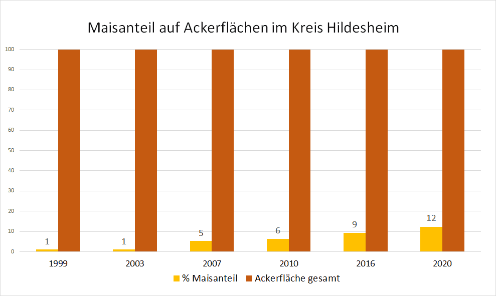 Auf der Grafik hat der VSR-Gewässerschutz die Entwicklung der Maisanbauflächen von 1999 bis 2020 im Kreis Hildesheim dargestellt. Die Monokulturen mit Mais haben bereits zu einer starken Nitratbelastung des Grundwassers geführt. Zukünftig muss hier noch weiter gehandelt werden, um die Nitratbelastung zu senken. Der VSR-Gewässerschutz kritisiert den hohen Einsatz von Mais in Biogasanlagen. Die Förderung von Biogasanlagen sollte auf nachhaltige Substrate abzielen. Die weitere Absenkung des Maisdeckel bei neu geförderten Anlagen auf 30 % ist ein Schritt in die richtige Richtung, reicht aber noch nicht.