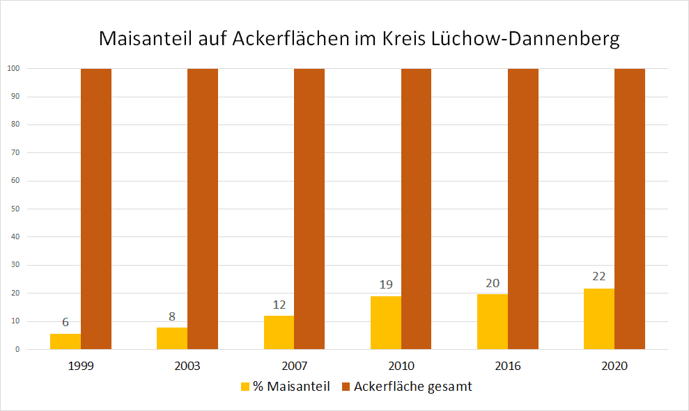 Auf der Grafik hat der VSR-Gewässerschutz die Entwicklung der Maisanbauflächen von 1999 bis 2020 im Kreis Lüchow-Dannenberg dargestellt. Die Monokulturen mit Mais haben bereits zu einer starken Nitratbelastung des Grundwassers geführt. Zukünftig muss hier noch weiter gehandelt werden, um die Nitratbelastung zu senken. Der VSR-Gewässerschutz kritisiert den hohen Einsatz von Mais in Biogasanlagen. Die Förderung von Biogasanlagen sollte auf nachhaltige Substrate abzielen. Die weitere Absenkung des Maisdeckel bei neu geförderten Anlagen auf 30 % ist ein Schritt in die richtige Richtung, reicht aber noch nicht.