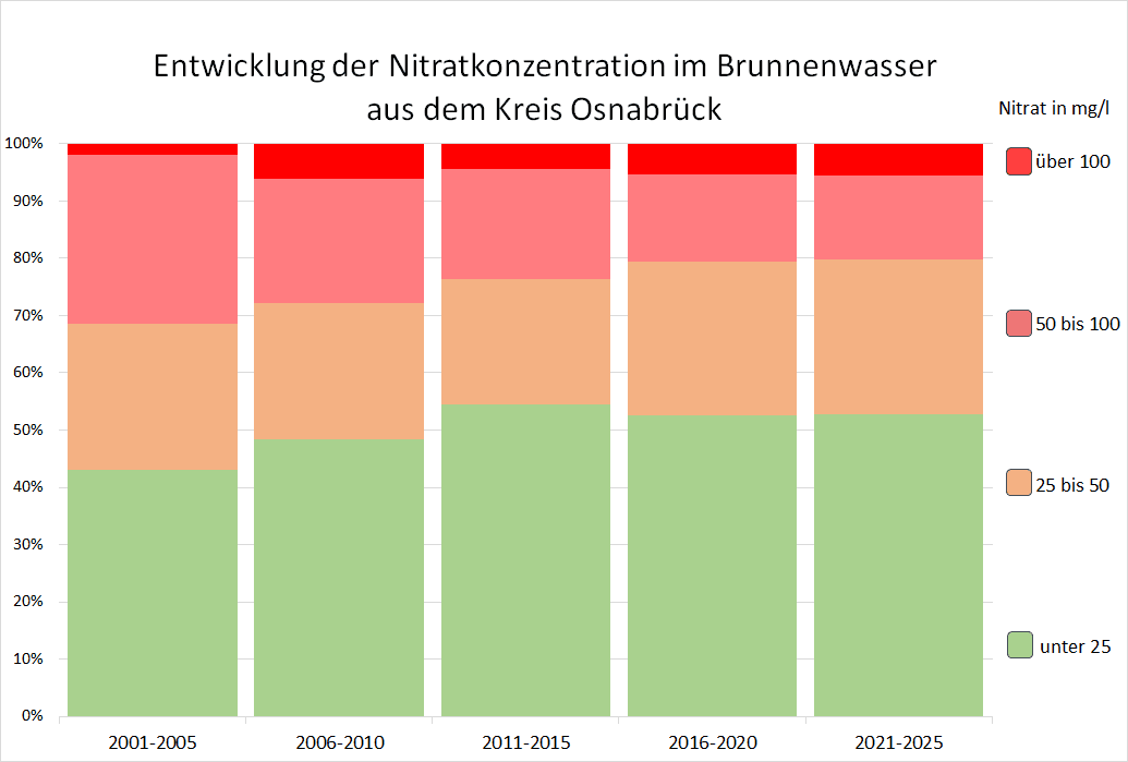 Der VSR-Gewässerschutz hat die Nitratergebnisse der 915 Brunnenwasseruntersuchungen im Kreis Osnabrück aus den Jahren 2001 bis 2025 ausgewertet. In dieser Zeit wurde der Nitratgrenzwert von 50 mg/l häufig nicht eingehalten. Während in den Jahren 2001–2005 noch 31,4 % der Brunnen den Grenzwert überschritten, waren es im Zeitraum 2021–2025 immer noch 20,2 %. Besonders problematisch ist, dass der Anteil der Brunnen mit einer Nitratbelastung von über 100 mg/l im gesamten Zeitraum auf 5,6 % stieg. Auch ist zu beobachten, dass der Anteil der gering belasteten Brunnen, mit unter 25 mg/l Nitrat anstieg.