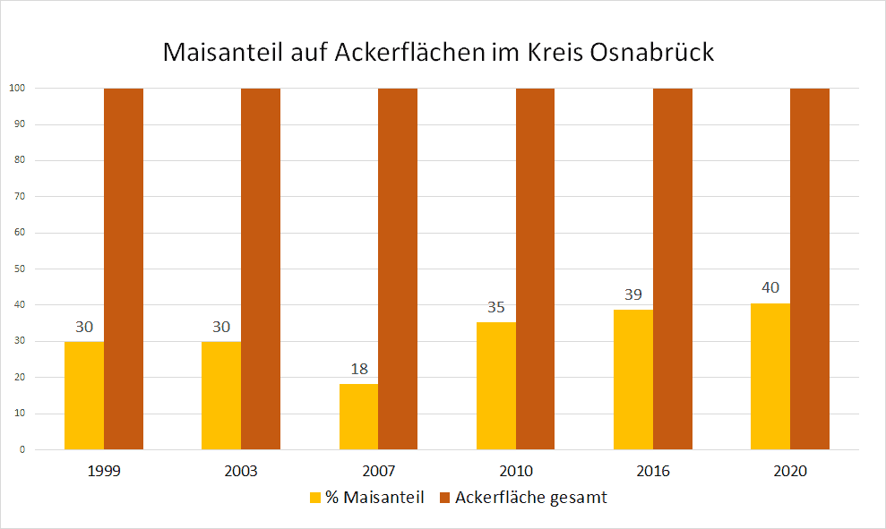 Auf der Grafik hat der VSR-Gewässerschutz die Entwicklung der Maisanbauflächen von 1999 bis 2020 im Kreis Osnabrück dargestellt. Die Monokulturen mit Mais haben bereits zu einer starken Nitratbelastung des Grundwassers geführt. Zukünftig muss hier noch weiter gehandelt werden, um die Nitratbelastung zu senken. Der VSR-Gewässerschutz kritisiert den hohen Einsatz von Mais in Biogasanlagen. Die Förderung von Biogasanlagen sollte auf nachhaltige Substrate abzielen. Die weitere Absenkung des Maisdeckel bei neu geförderten Anlagen auf 30 % ist ein Schritt in die richtige Richtung, reicht aber noch nicht.