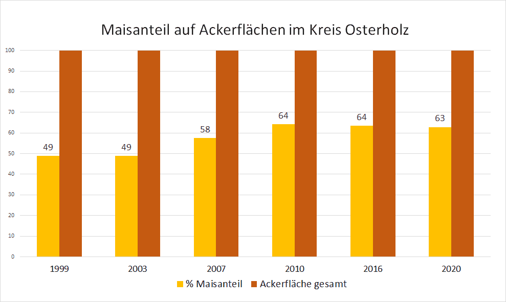 Auf der Grafik hat der VSR-Gewässerschutz die Entwicklung der Maisanbauflächen von 1999 bis 2020 im Kreis Osterholz dargestellt. Die Monokulturen mit Mais haben bereits zu einer starken Nitratbelastung des Grundwassers geführt. Zukünftig muss hier noch weiter gehandelt werden, um die Nitratbelastung zu senken. Der VSR-Gewässerschutz kritisiert den hohen Einsatz von Mais in Biogasanlagen. Die Förderung von Biogasanlagen sollte auf nachhaltige Substrate abzielen. Die weitere Absenkung des Maisdeckel bei neu geförderten Anlagen auf 30 % ist ein Schritt in die richtige Richtung, reicht aber noch nicht.