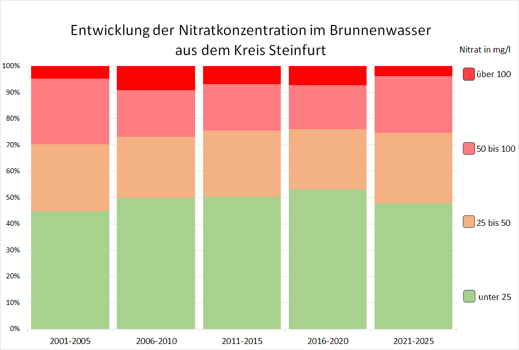 Der VSR-Gewässerschutz hat die Nitratergebnisse der 2271 Brunnenwasseruntersuchungen im Kreis Steinfurt aus den Jahren 2001 bis 2025 ausgewertet. In dieser Zeit wurde der Nitratgrenzwert von 50 mg/l häufig nicht eingehalten. Während in den Jahren 2001–2005 noch 29,6 % der Brunnen den Grenzwert überschritten, waren es im Zeitraum 2021–2025 immer noch 25,4 %. Besonders problematisch ist, dass der Anteil der Brunnen mit einer Nitratbelastung von über 100 mg/l im gesamten Zeitraum nur auf 3,8 % sank. Auch ist in den letzten 5 Jahren zu beobachten, dass der Anteil der gering belasteten Brunnen, mit unter 25 mg/l Nitrat leicht zurückging. Insgesamt zeigt sich, dass die Maßnahmen in der Landwirtschaft zur Verringerung der Nitratbelastung im Grundwasser Wirkung zeigen. Allerdings ist die Nitratbelastung bisher nicht wie gehofft gesunken.