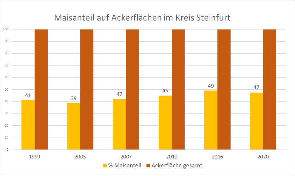 Auf der Grafik hat der VSR-Gewässerschutz die Entwicklung der Maisanbauflächen von 1999 bis 2020 im Kreis Steinfurt dargestellt. Die Monokulturen mit Mais haben bereits zu einer starken Nitratbelastung des Grundwassers geführt. Zukünftig muss hier noch weiter gehandelt werden, um die Nitratbelastung zu senken. Der VSR-Gewässerschutz kritisiert den hohen Einsatz von Mais in Biogasanlagen. Die Förderung von Biogasanlagen sollte auf nachhaltige Substrate abzielen. Die weitere Absenkung des Maisdeckel bei neu geförderten Anlagen auf 30 % ist ein Schritt in die richtige Richtung, reicht aber noch nicht.