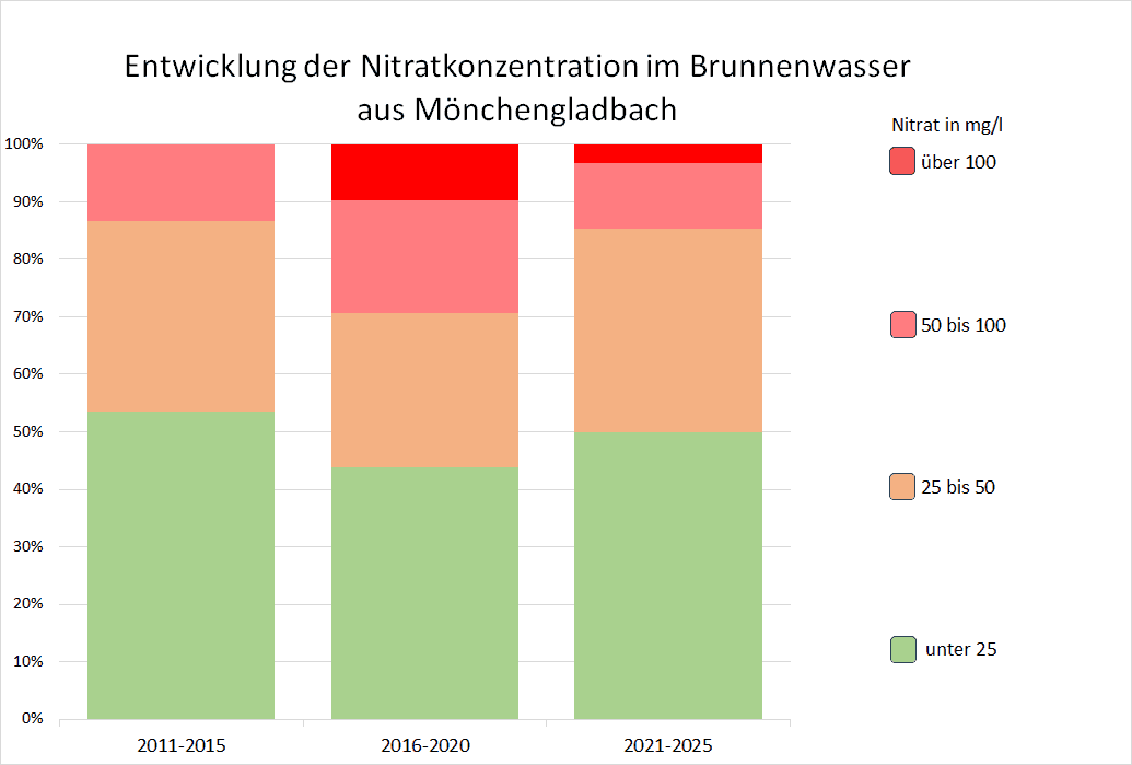 Die Auswertung der Brunnenwasserproben vom 11.8.2025 in Mönchengladbach zeigt immer noch eine hohe Nitratbelastung: In jeder zweiten der 121 untersuchten privat genutzten Brunnen wurde der Nitratwert von 50 Milligramm pro Liter überschritten. Besonders erschreckend war die Belastung in je einem Brunnen Hehn mit 162 Milligramm Nitrat pro Liter (mg/l), in Merreter mit 146 mg/l, in Varbrook mit 128 mg/l, in Broich mit 123 mg/l und in Neuwerk mit 100 mg/l. Etwas weniger hoch belastet ist das Brunnenwasser in Winkeln mit 78 mg/l Nitrat, in Bettrath-Hoven mit 76 mg/l und in Bockert mit 74 mg/l.