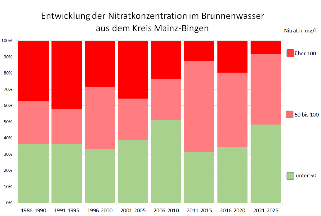 mg/l häufig nicht eingehalten. Während in den Jahren 1986–1990 noch 63,7 % der Brunnen den Grenzwert überschritten, waren es im Zeitraum 2006–2010 nur 48,9 %. Nur leider hielt der Trend nicht an. Während der Anteil der belasteten Brunnen in den nächsten 10 Jahren immer über 65 % lag, sang der Wert erst in der letzten Messperiode 2021-2025 auf 51,7 %. Besonders problematisch ist, dass in dieser Messperiode immer noch in 8,2 % der Brunnen über 100 mg/l Nitrat im Wasser feststellbar ist. Auch das Verhalten der gering belasteten Brunnen folgt einem ähnlichen Trend.