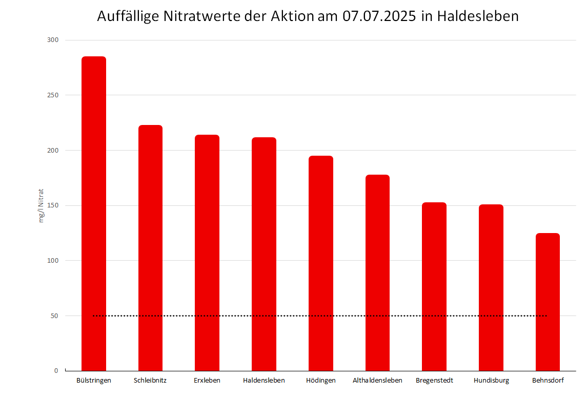 Die Auswertung der Brunnenwasserproben vom 7.7.2025 in Haldesleben zeigt immer noch eine hohe Nitratbelastung: In jeder dritten der 83 untersuchten privat genutzten Brunnen wurde der Nitratwert von 50 Milligramm pro Liter überschritten. Besonders erschreckend war die Belastung in je einem Brunnen in Bülstringen mit 183 Milligramm Nitrat pro Liter (mg/l), in Schleibnitz und in Erxleben mit 159 mg/l, in Haldensleben mit 138 mg/l, in Hödingen mit 128 mg/l, in Althaldensleben mit 104 mg/l, in Bregenstedt mit 97 mg/l und in Hundisburg mit 93 mg/l. Etwas weniger hoch belastet ist das Brunnenwasser in Behnsdorf mit 71 mg/l Nitrat, in Rottmersleben mit 65 mg/l und in Magdeburg mit 56 mg/l.