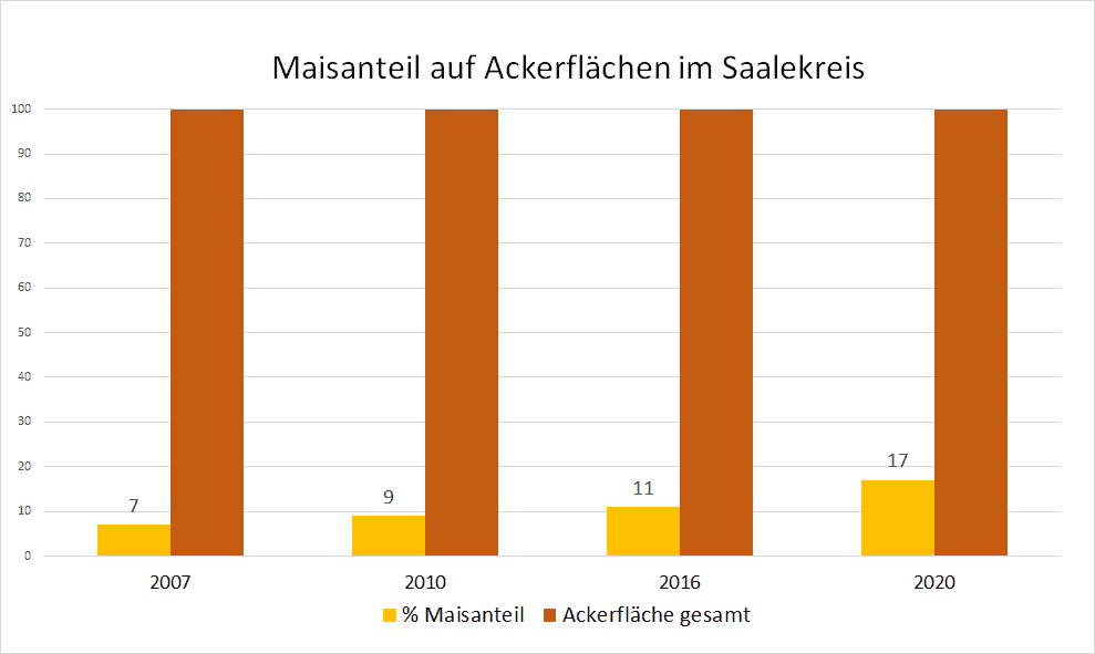 Auf der Grafik hat der VSR-Gewässerschutz die Entwicklung der Maisanbauflächen von 2007 bis 2020 im Kreis Saalekreis dargestellt. Die Monokulturen mit Mais haben bereits zu einer starken Nitratbelastung des Grundwassers geführt. Zukünftig muss hier noch weiter gehandelt werden, um die Nitratbelastung zu senken. Der VSR-Gewässerschutz kritisiert den hohen Einsatz von Mais in Biogasanlagen. Die Förderung von Biogasanlagen sollte auf nachhaltige Substrate abzielen. Die weitere Absenkung des Maisdeckel bei neu geförderten Anlagen auf 30 % ist ein Schritt in die richtige Richtung, reicht aber noch nicht.