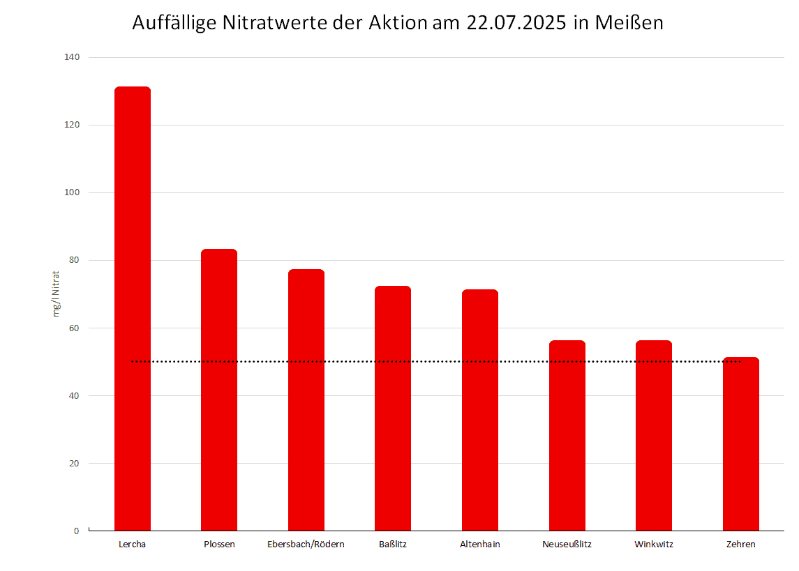 Die Auswertung der Brunnenwasserproben vom 22.7.2025 in Meißen zeigt immer noch eine hohe Nitratbelastung: In jeder dritten der 21 untersuchten privat genutzten Brunnen wurde der Nitratwert von 50 Milligramm pro Liter überschritten. Besonders erschreckend war die Belastung in je einem Brunnen in Lercha mit 131 Milligramm Nitrat pro Liter (mg/l), in Plossen mit 83 mg/l, in Ebersbach/Rödern mit 72 mg/l und in Altenhain mit 71 mg/l. Etwas weniger hoch belastet ist das Brunnenwasser in Neuseußlitz und in Winkwitz mit 56 mg/l Nitrat und in Zehren mit 51 mg/l.