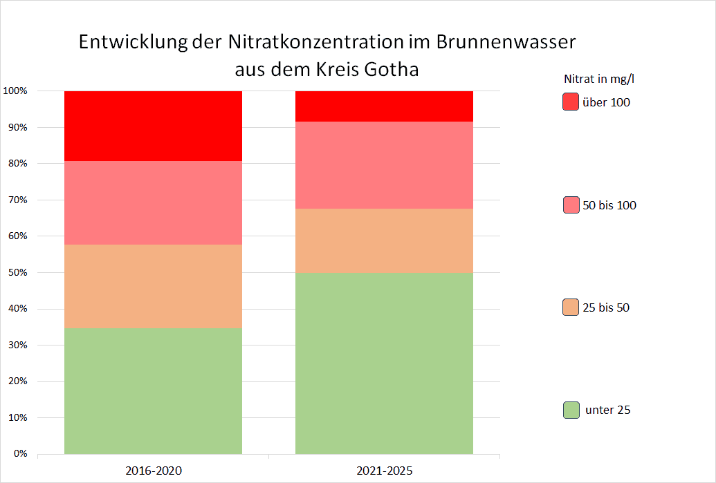 Der VSR-Gewässerschutz hat die Nitratergebnisse der 136 Brunnenwasseruntersuchungen im Kreis Gotha aus den Jahren 2016 bis 2025 ausgewertet. In dieser Zeit wurde der Nitratgrenzwert von 50 mg/l häufig nicht eingehalten. Während in den Jahren 2016–2020 noch 42,3 % der Brunnen den Grenzwert überschritten, waren es im Zeitraum 2021–2025 immer noch 32,4 %. Besonders problematisch ist, dass der Anteil der Brunnen mit einer Nitratbelastung von über 100 mg/l im gesamten Zeitraum nur auf 8,3 % sank. Auch ist zu beobachten, dass der Anteil der gering belasteten Brunnen, mit unter 25 mg/l Nitrat anstieg. Insgesamt zeigt sich, dass die Maßnahmen in der Landwirtschaft zur Verringerung der Nitratbelastung im Grundwasser Wirkung zeigen. Allerdings ist die Nitratbelastung bisher nicht wie gehofft gesunken.