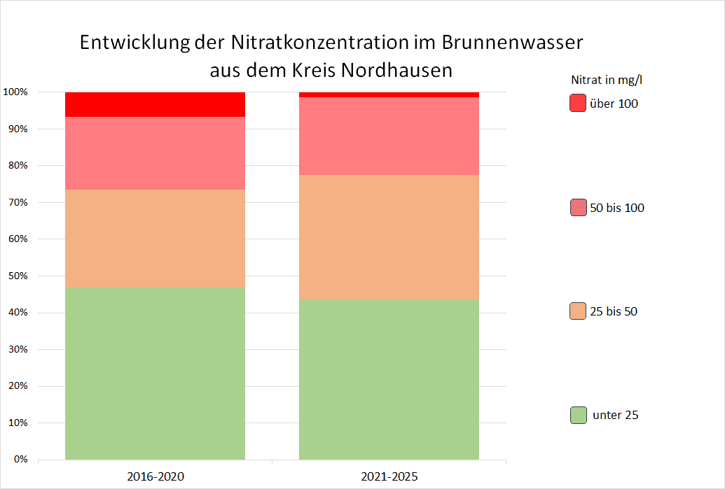 Der VSR-Gewässerschutz hat die Nitratergebnisse der 383 Brunnenwasseruntersuchungen im Kreis Nordhausen aus den Jahren 2016 bis 2025 ausgewertet. In dieser Zeit wurde der Nitratgrenzwert von 50 mg/l häufig nicht eingehalten. Während in den Jahren 2016–2020 noch 26,5 % der Brunnen den Grenzwert überschritten, waren es im Zeitraum 2021–2025 immer noch 22,5 %. Besonders problematisch ist, dass der Anteil der Brunnen mit einer Nitratbelastung von über 100 mg/l im gesamten Zeitraum nur auf 1,4 % sank. Auch ist in den letzten fünf Jahren zu beobachten, dass der Anteil der gering belasteten Brunnen, mit unter 25 mg/l Nitrat leicht zurückging. Insgesamt zeigt sich, dass die Maßnahmen in der Landwirtschaft zur Verringerung der Nitratbelastung im Grundwasser Wirkung zeigen. Allerdings ist die Nitratbelastung bisher nicht wie gehofft gesunken.